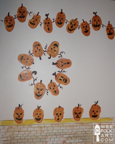 What happens when you combine a compulsive doodler, orange paint and an hour long phone conversation? A gaggle of pumpkins, of course! Seriously, I’m on the phone and there was my cheese box of paints…