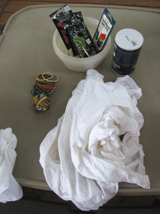 We started with washed but damp 100% cotton shirts, Dylon brand permanent dyes, salt, rubber bands and containers. The Dylon brand dyes are reactive with salt and warm tap water (safer for the kids with no boiling water… of course don’t eat it or get it in your eyes). You will probably want gloves… but I didn’t have any. I think I need a manicure before the wedding ;). The kids were dressed in their swim suits and old t-shirts.