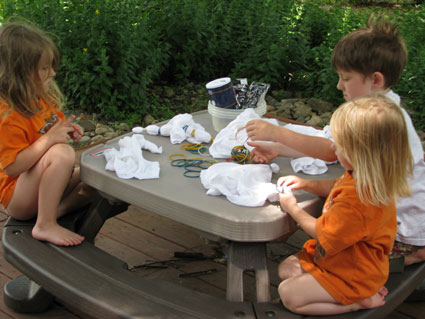 Then off course comes the tying part. Bug was able to do this part on his own but the girls needed help. They would pinch off the fabric they wanted tyed and I put the rubber band on for them.