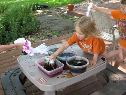 It was very smart making this an outside activity. Our first and only attempt was inside and the dyes stained my counters and a rag rug 🙁 We will definitely give it another try, OUTSIDE this time. Love your blog.