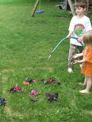 Then we rinsed the shirts until the water ran clear (I actually did this part… the kids held the hose for me).