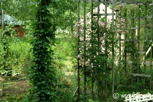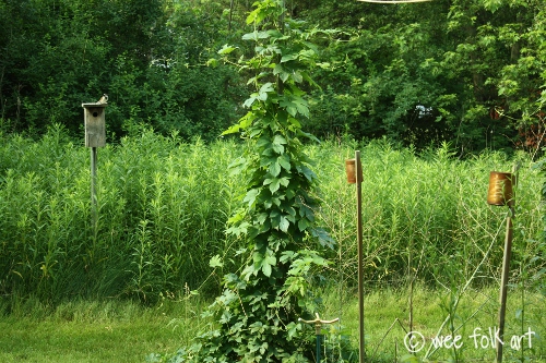 Those would be my hops. My sons brew beer. I try to keep them in hops. Hops are really quite expensive to buy. But confession… even if they didn't want them, I think I would still grow them. They look so cool in the garden. We have strings strung across the garden. They make a lovely canopy.