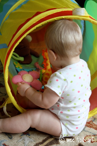 I love those tunnels. And they collaspe to nothing for storage! Must admit my cats like it every bit as much as my son, who is also 9 months old now too. Little Lady is so adorable. That top photo looks like it was done at a studio. Welcome back.