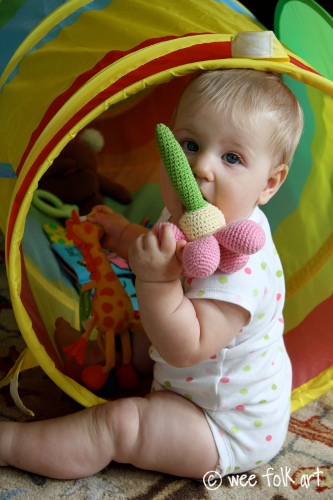 In the meantime… here’s the Little Lady. (We just figured it out… she is 9 months old, I’ve seen her 7 times although she lives 7 hours from us… but it still isn’t enough 🙂 Miss her like crazy each time we part! Anyway… I really don’t want to be one of those Gammys that always comes bearing gifts, but I saw this, and couldn’t resist. She adored it.