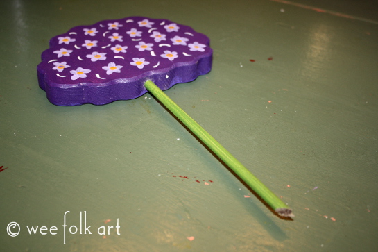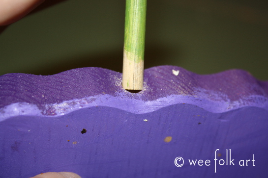 At this point, you can glue the dowel rods into the flowers. I didn’t glue mine in. The fit was nice and tight, and because the dowel rods were going to be in moist soil, I thought they could rot out and need replacing. It would be far easier to do that if they weren’t glued in. If I was using this in a dry arrangement, I would glue them.