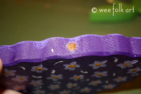 These flowers are the same shape, just different sizes. I’m not sure what flower it is suppose to look like, I just wanted a pointy petaled flower 🙂 I began by painting the front and back off white. I then used gold paint to create individual petals and adding a touch of gold in the petal itself. This was followed with more definition added the each petal using violet. Note how translucent the paint is. Use very little paint on a wet brush to achieve this result. I then used the dark purple and short swirls to add the deep colored center. Finally, when it was dried, I added a gold circle in the center.