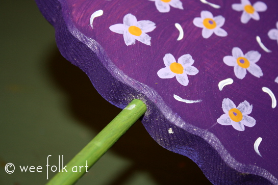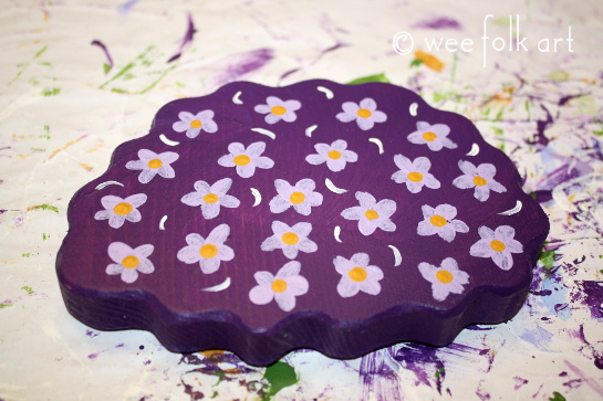 I made this flower to resemble a hydrangea… sorta, kinda 🙂 Although it has the appearance of a large flower, it is really made up of many small flowers. I began by painting the front and back deep purple. I randomly added little 5 petal flowers using the side of the paint brush bristles with violet paint. For the centers, I dipped the back of a paint brush into gold paint and dabbed it in the center of the little flowers. Finally, using white paint, I added little “swishes” around the flower to add definition.