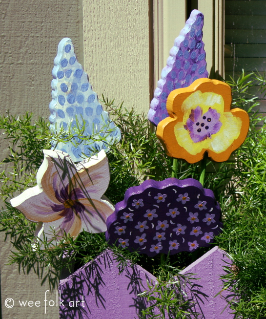 If I “planted” wooden flowers, they would not need sun to thrive and would give me the color I was craving. So, I designed several flowers, and I am thrilled with the outcome! I plan to make autumn flowers and something for the boxes for winter. Love it when the end results match your vision! Try making your own bouquet of flowers. It’s easier than you might think!