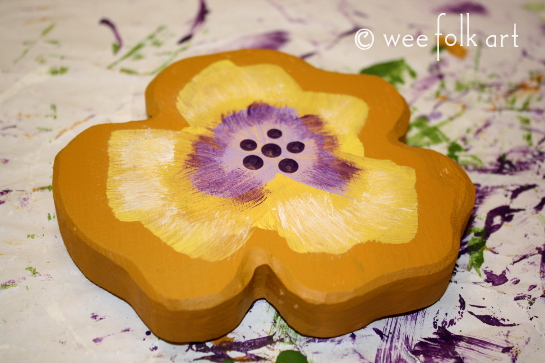So, I’m thinking this wound up looking like pansy 🙂 I painted the front and back gold. I then went around and added yellow, with white accents at the tip of the yellow. Then, I added another layer of violet, with dark purple accents at the tip. Finally, using the back of my brush, I added dabs dark purple to the center of the flower.