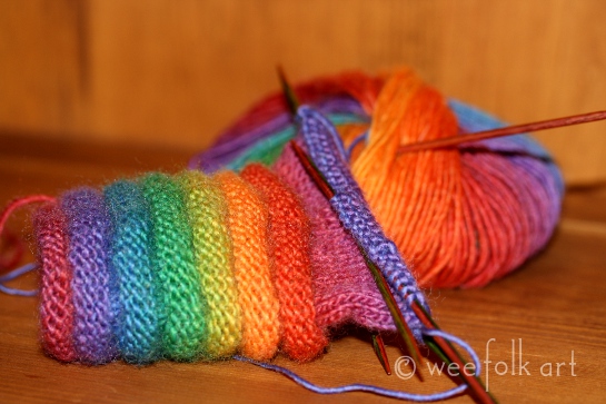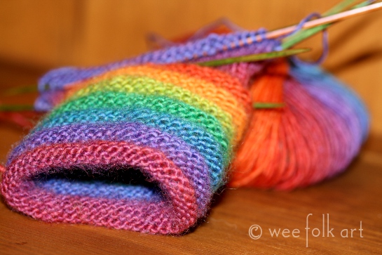 I’ve managed to get in a few late night hours knitting my rainbow mittens. Size two needles do not make for quick knitting! This mitts are knitted in the round, and I can’t say I’m a huge fan of purling in the round. I’m all thumbs 🙂 Despite that, the yarn is so wonderful, and the colors so happy, it’s hard not to enjoy every stitch!