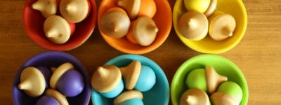Preschoolers will love sorting and matching colors with our Wooden Sorting Bowls and Wooden Acorns Craft. These pretty little acorns will help young children in color recognition, counting and sorting abilities. It also encourages agility and dexterity in wee hands. And, because they are beautiful, they add to the warmth and charm to any room! Wooden Sorting Bowls and Wooden Acorns Craft Materials: 6 wooden bowls – 2 1/2″ bowls from Casey’s Wood Products 18 wood acorns – 1 1/32″ acorns from Casey’s Wood Products sandpaper, fine wood stain (optional) wood paint beeswax finish Note: All materials used should be non toxic and child safe. IMPORTANT SAFETY WARNING: The acorns are small and considered a choke hazard. Although generally it is recommended that small parts should not be given to children under 3 years of age, we highly recommended you do not give small parts to any child that still puts toys in their mouth, no matter how old they are! Wooden Sorting Bowls and Wooden Acorns Craft Directions: Using fine grit sandpaper, sand wood pieces smooth. Wipe off to remove any saw dust. Using a non toxic, child safe wood stain, stain just the OUTSIDE of the bowls and the caps of the acorns. I found it easiest to use a hard bristle paint brush to apply the stain to the acorn caps. Note: If you prefer, you can choose NOT to stain the wood. The bowls and acorns in this tutorial have not been stained. Choose 6 different colors of paint. Paint the inside of each bowl and the rim a different color. Paint your acorn bottoms to match the inside of the bowls. You will paint groups of three acorns the same color. When the paint and stain are thoroughly dry, seal the bowls and acorns with a Beeswax Finish. Notice the 2 wooden acorns below. They have not been stained. The one on the right was sealed with our Beeswax Finish. It naturally gives the wood a wonderful patina. Now your bowls and acorns are ready to be played with. Remember to reapply the Beeswax Finish periodically to the wood to maintain a beautiful luster and to prolong the life of the wood. OTHER IDEAS FOR USING THE PAINTED WOODEN CUPS AND WOODEN ACORNS CRAFT Of course, children will come up with their own ways to use the bowls and acorns 🙂 The bowls and acorns will undoubtedly be moved to play kitchens, the acorns can be used for counting and sorting, and, you can flip the bowls over, and hide acorns under them for a super fun guessing game 🙂 Photos: 4-12-12